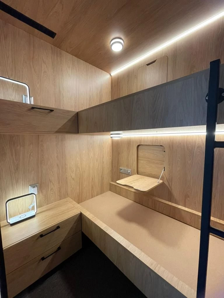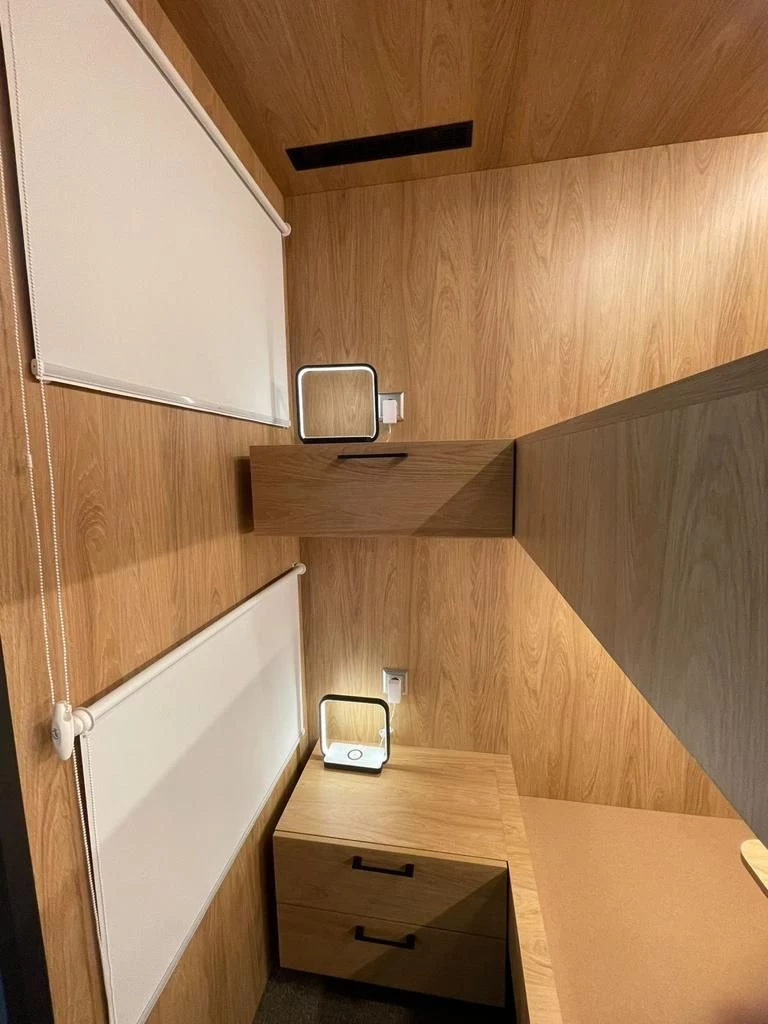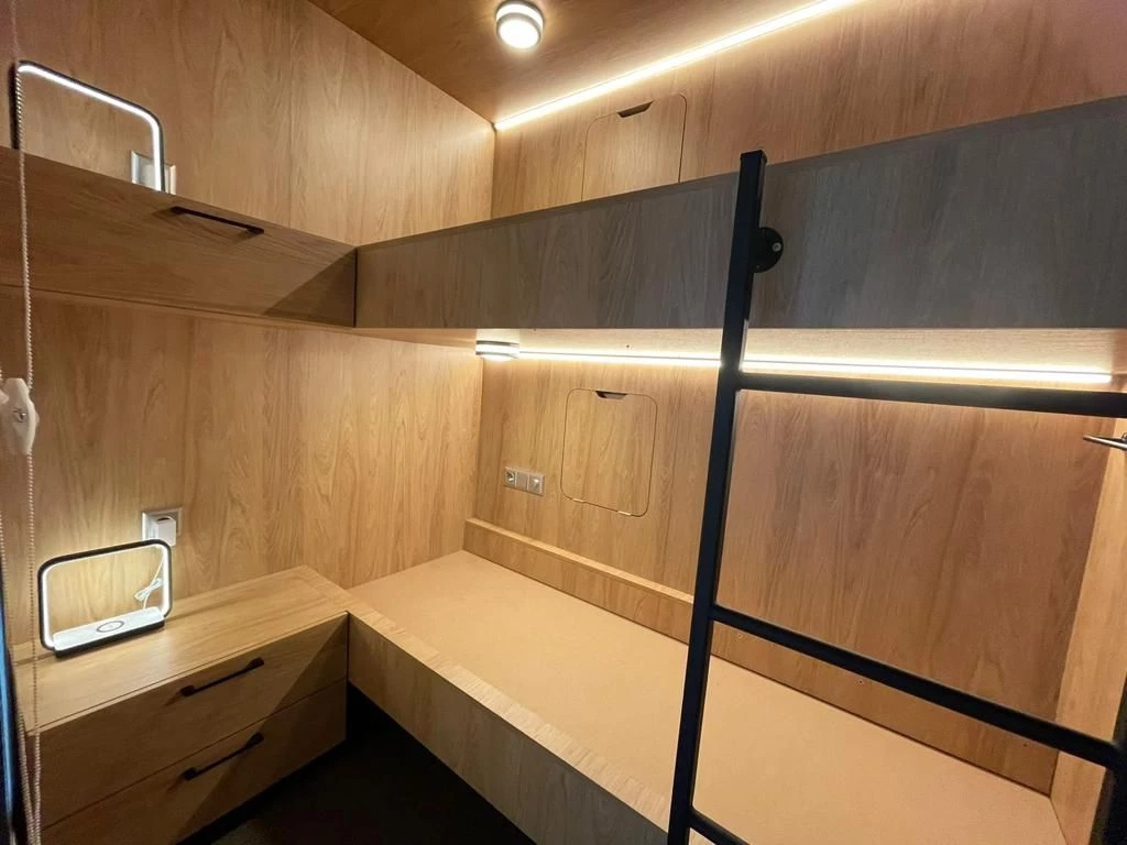 Наполнение - Спальное место с матрасом 2шт. + Рул. штора 2шт. + Тумба 2шт. + Стеллаж 2шт. + Наст. лампа 2шт. + Полотенцедерж. 2шт.